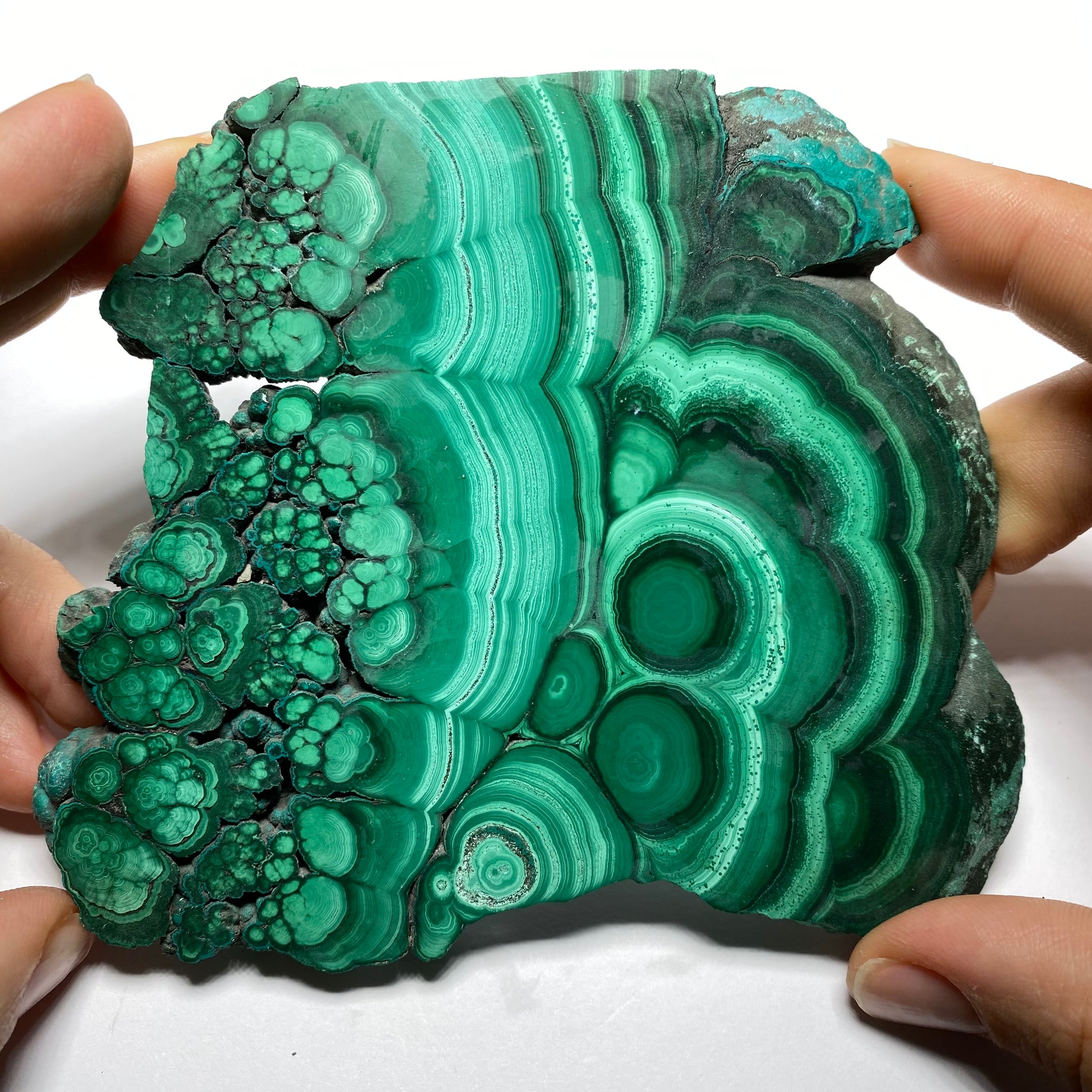 Rich Green Malachite from the Congo. These finest Malachite comes from the Congo. With so many patterns in a single slab, seemingly endless one-of-a-kind cabochons could be made