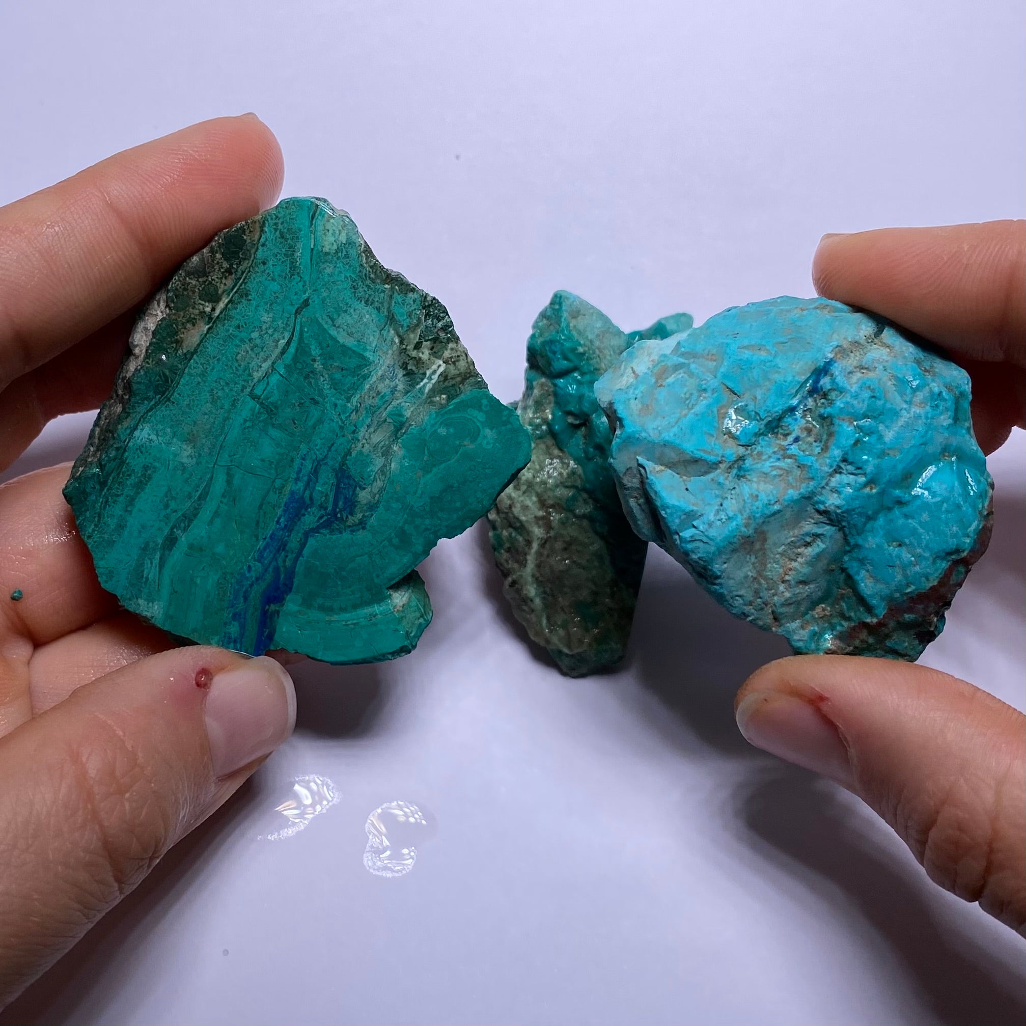 The exquisite rich blue color of Eilat stone and it's marbled patterning is due to its heterogenous mixture of secondary copper minerals such as malachite, azurite, turquoise, pseudomalachite, chrysocolla and others.