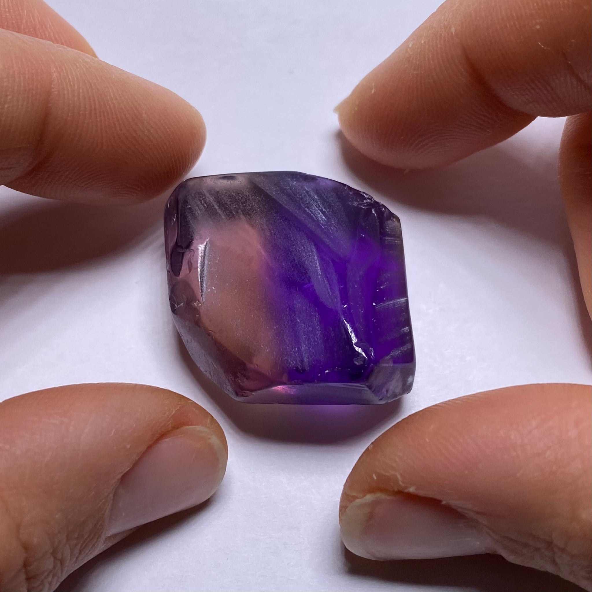 Ametrine is cut from nodules, leaving a dull surface from the saw. To improve appearance and marketability, the stones are tumbled for a polished finish. Tumbling may also help bypass Bolivian export restrictions on rough stones by giving them a 'finished' look.