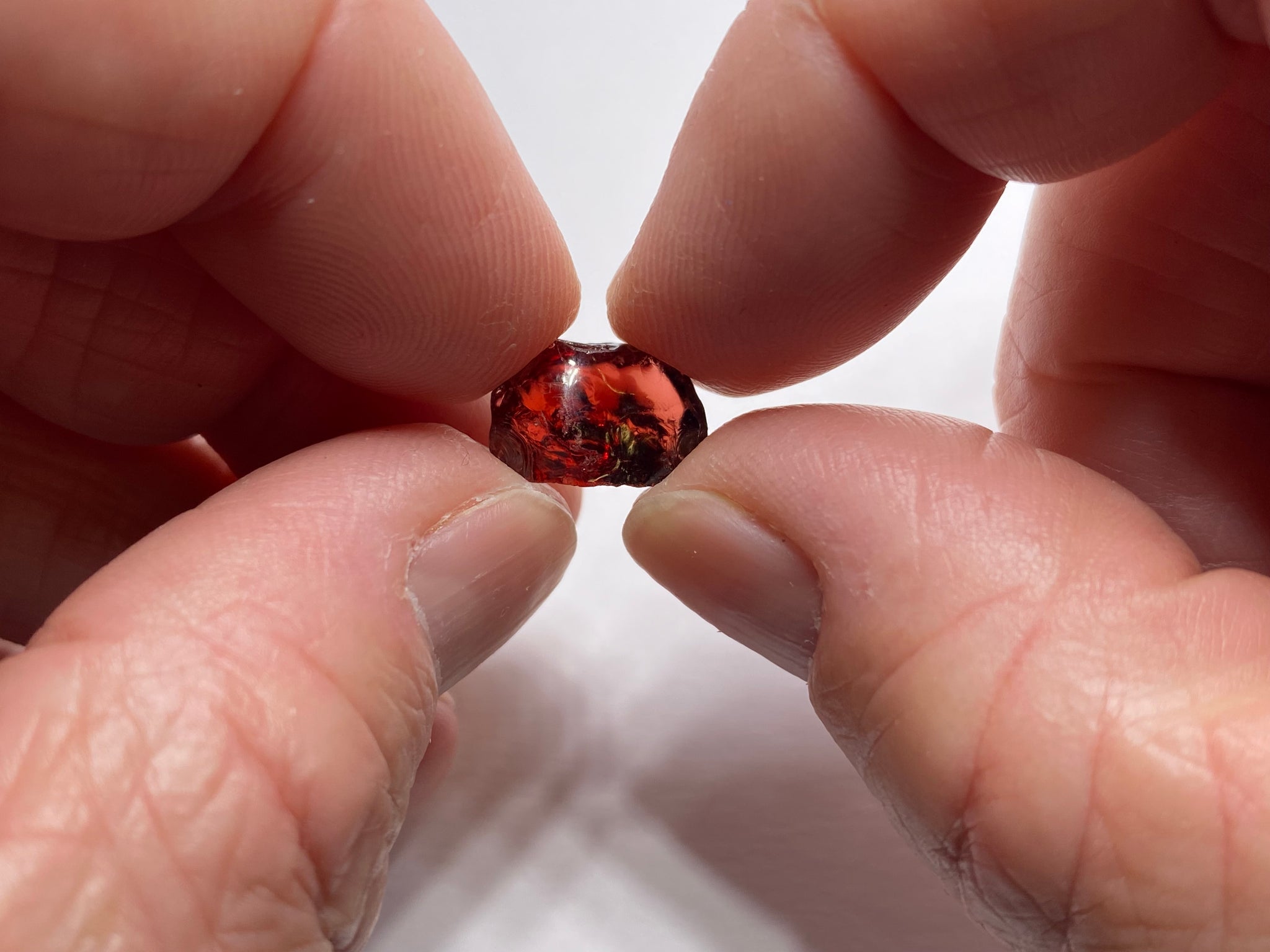 A new find of Malaya Garnet in the deeper end of the Malaya color range, showing rich reddish-orange tones with a warm, internal glow. Stones of this depth are less common and often display a subtle mix of ember and rose hues depending on the light source.