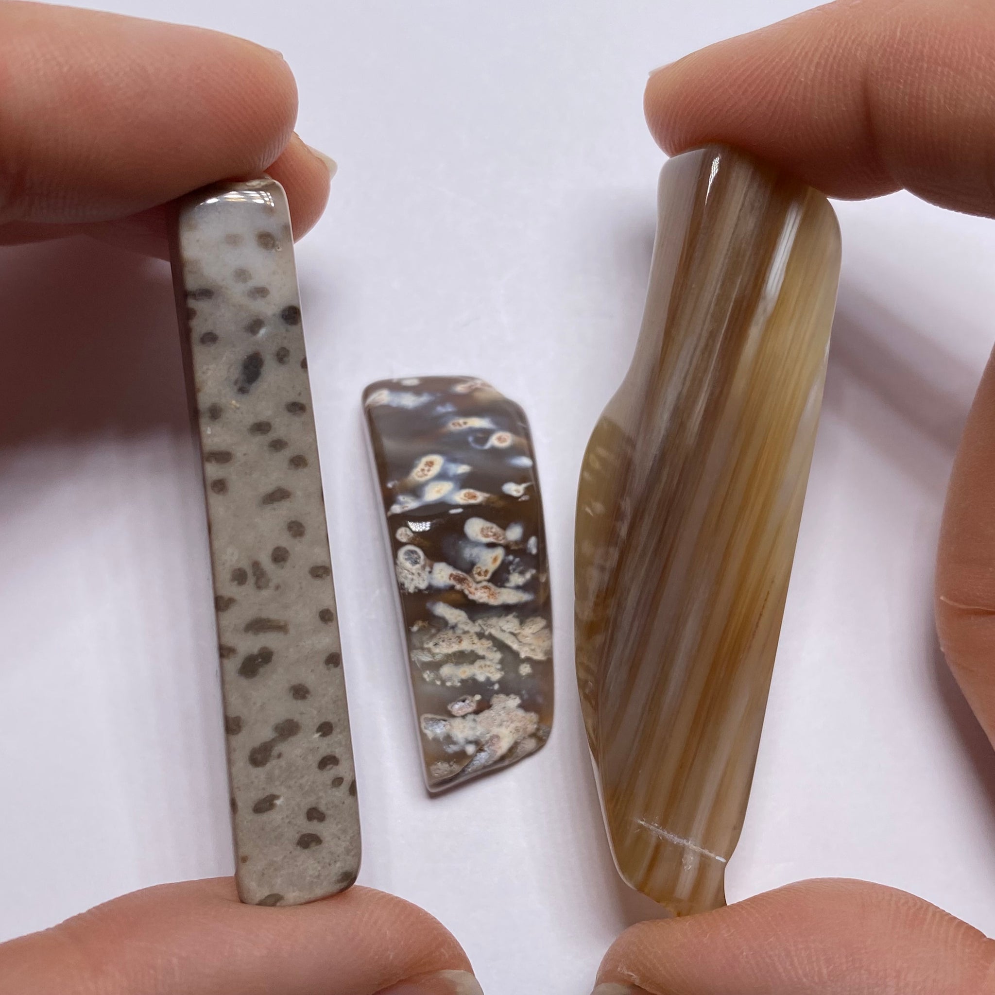 Polished slices of petrified wood from the region surrounding the ancient city of Bagan, Burma. These specimens retain the structural patterns of the original wood, replaced over millions of years by silica and other minerals. The result is a fossilized material with layered browns, tans, greys, and occasional dendritic or cellular textures. Customarily polished in this form, they are ready for final shaping into cabochons.