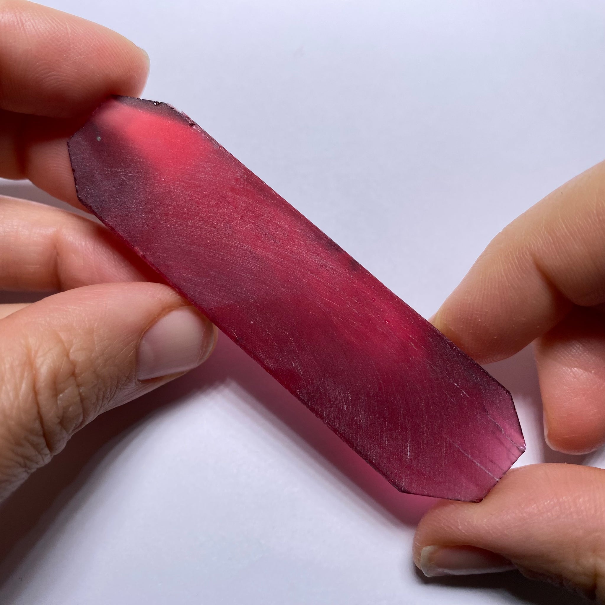 Synthetic Bixbite (Red Beryl) rough produced by the hydrothermal growth method. Formed under high temperature and pressure in an aqueous solution, this process replicates natural crystallization conditions and results in sharp color zoning and natural-looking inclusions. Vivid red coloration is chromium-based and consistent throughout the piece